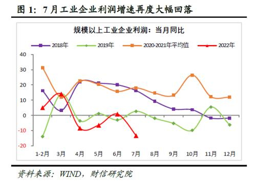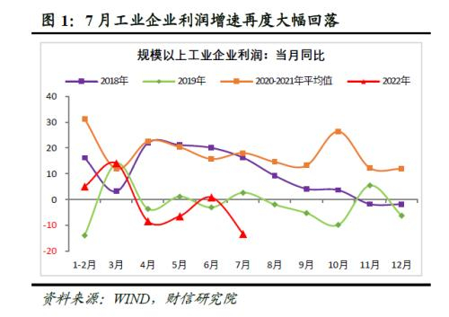 事件:2022年1-7月份全国规模以上工业企业利润总额同比下降1.1%,增速较1-6月份大幅回落2.1个百分点;根据我们的测算,7月当月规上工业企业利润同比下降13.4%,增速创下年内新低,较上月大幅回落14.2个百分点,企业经营压力明显增加。分行业看,占规模以上工业利润比重为76.2%的制造业,1-7月份利润同比下降12.6%,拖累明显;41个工业大类行业中,有25个行业利润同比下降,工业企业亏损面仍然较大。