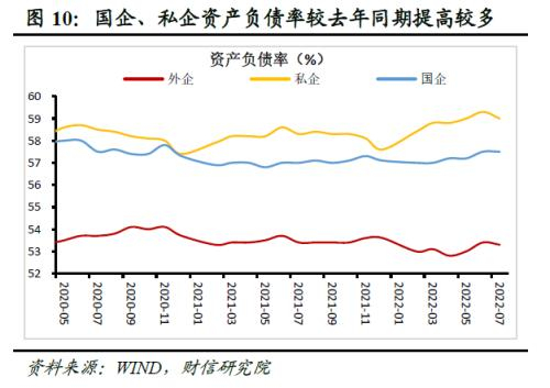 分企业类型看,国企和私企资产负债率同比提高较多,外企资产负债率回落。7月末国企、私企和外企资产负债率分别为57.5%、59%和53.3%,分别较去年同期提高0.5、提高0.7和降低0.1个百分点(见图10)。由于不同类型企业的资产和负债增速数据需要晚几天公布,因此暂时无法完全判定上述三者谁是被动加杠杆主力。但根据以往的数据,私企资产增速自4月份高点以来持续回落,加之私企1-7月利润同比降幅较1-6月扩大3.7个百分点,回落幅度高出全部工业企业1.6个百分点,预计私企资产增速放缓较多的概率偏大。此外,1-7月份外企利润同比下降14.5%,三类企业中表现垫底,加之6月末外企资产和负债增速均较去年同期低1.9个百分点,外企资产负债表收缩风险亦较大,仍需政策加大力度稳外资稳外贸。