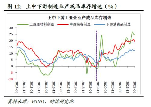 展望未来,新一轮去库存周期确定已经启动,预计工业企业大概率继续去库存。一是根据历史经验,PPI增速与工业企业库存增速高度相关,国内PPI增速持续大幅回落,将推动企业全面加速转向去库存周期。二是自2019年末以来工业企业补库存周期已持续两年半以上,接近历史上国内补库存周期的最长期限,未来持续去库存已是大势所趋,同时分行业看,上、中、下游制造业库存增速均已处于历史高位区间,后续上行动力也均不足(见图12)。三是随着疫情、高温干旱天气等短期冲击消退,加上逆周期政策进一步发力显效,国内需求逐步恢复也有利于消化前期积压的库存。