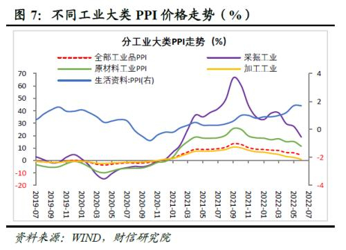 三是上游利润占比连续三个月回落,工业利润结构持续好转。1-7月上游采矿业和原材料制造业利润占全部工业的比重为44.3%,较1-6月份回落1.3个百分点,连续三个月回落;同期中游装备制造业利润占比较1-6月份提高1.3个百分点,下游消费品制造业利润占比仍处低位(见图6)。上中下游利润分化继续有所缓解:一方面与价格的分化减弱密切相关,如7月份采掘工业和原材料工业PPI增速分别较上月大幅回落8.5和3.8个百分点,同期加工工业PPI增速较上月仅回落1.5个百分点,生活资料PPI增速与上月持平(见图7),上中下游价格增速差明显缩小;另一方面产业链供应链持续恢复、出口强劲和逆周期政策加码,也对推动中下游行业生产和利润恢复产生了重要积极作用。