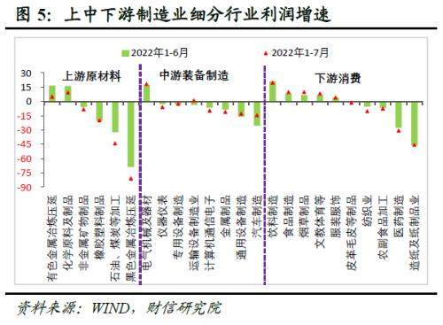 二是从制造业内部看,上游原材料制造业是主要拖累,中游装备制造业利润继续改善。其一,受大宗商品价格回落较多、房地产等下游需求不足和企业预期偏弱等多重因素的影响,上游原材料行业利润降幅明显扩大,如1-7月份原材料制造业利润同比下降21.6%,降幅较1-6月份扩大7.6个百分点(见图4-5),影响规模以上工业企业利润增速较1-6月份回落2.2个百分点,是下拉工业企业利润增速最多的板块。其二,受益于产业链供应链持续恢复,加之出口增长保持韧性、政策扶持力度加大,1-7月份中游装备制造业利润降幅较1-6月份收窄2.1个百分点(见图4),7月当月利润增速较6月份加快2.7个百分点至6.8%,连续三个月回升。分行业看,7月分别汽车制造业利润增速较6月份加快30.1个百分点至77.8%,是利润增长最快的行业之一,其年内累计利润降幅亦明显收窄(见图5)。其三,受消费需求恢复偏慢和医药行业拖累显著的影响,1-7月份消费品制造业利润同比下降10.3%,降幅较1-6月份扩大1.5个百分点(见图4)。其中,1-7月份医药制造利润同比下降30.7%,降幅较1-6月扩大3.1个百分点,拖累最大;此外纺织业、农副食品加工业和皮革毛皮等制造业利润降幅也均有所扩大(见图5)。