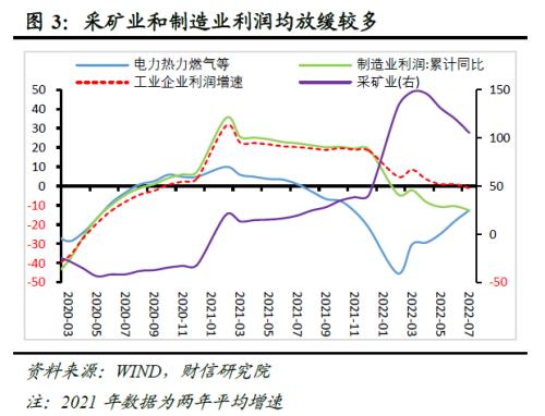 一是从三大门类看,采矿业和制造业利润均放缓较多,电力热力燃气等供应业利润持续改善。如1-7月份,采矿业、制造业利润同比分别为105.3%、-12.6%,增速较1-6月份分别回落14.5和2.2个百分点,回落幅度均较大;同期电力、热力、燃气及水生产和供应业利润同比下降12.5%,降幅较1-6月份收窄5.6个百分点,连续5个月收窄,利润持续明显改善。