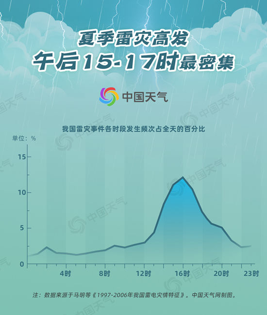 一天之中,我国各地的雷暴发生时间一般集中在午后到傍晚,15时至17时为最高峰。据中国气象科学研究院的统计数据显示,在1997年至2006年这10年间,雷灾事故的日变化特征呈现典型的单峰型,13时开始快速上升,15时至17时达到高值,16时达到峰顶,占比17.1%。