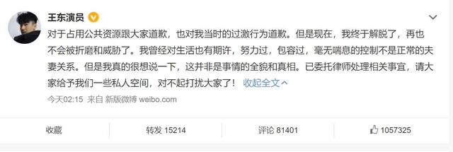 随后,王东在个人微博中回应:“对我当时的过激行为道歉。但是现在,我终于解脱了,再也不会被折磨和威胁了。”“这并非是事情的全貌和真相。已委托律师处理相关事宜。”