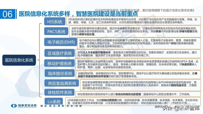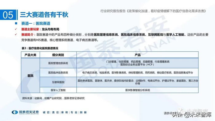 赛道主要玩家:龙头均有布局。赛道简介:医院赛道中的产品有四种细分类别,分别是医院管理信息系统、医院临床信息系统、互联网医院与医学人工智能。这些产品的主要 竞争赛道有HIS赛道、核心管理系统赛道、电子病历赛道等。