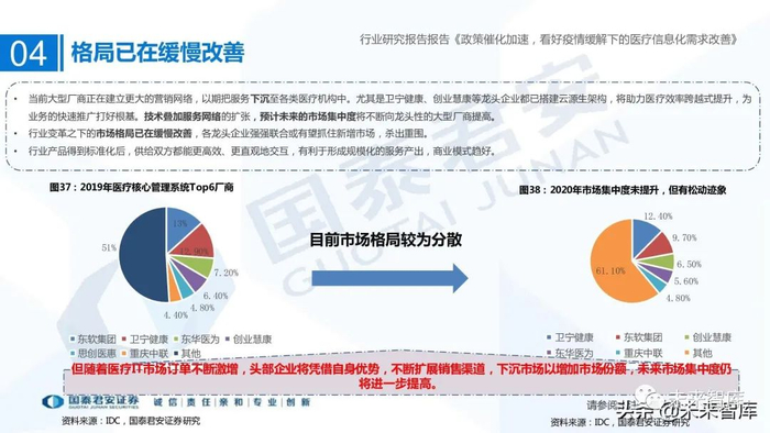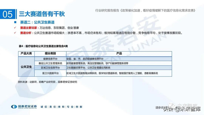 赛道主要玩家:万达信息、东软集团、创业慧康。赛道分析:公共卫生赛道市场规模大;渗透率不高,市场仍未饱和;维持较高增速且格局分散,竞争格局平均,处于接棒发展阶段。