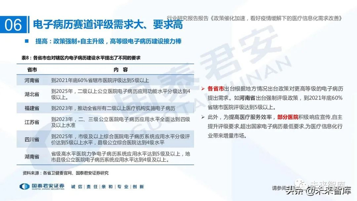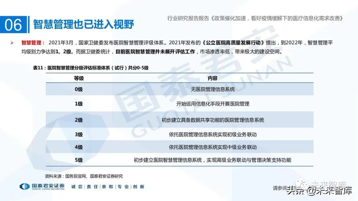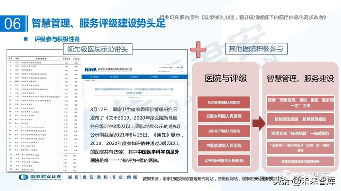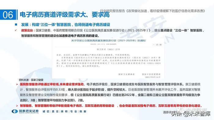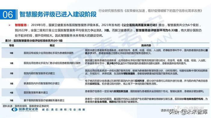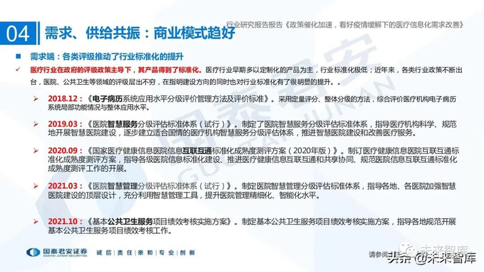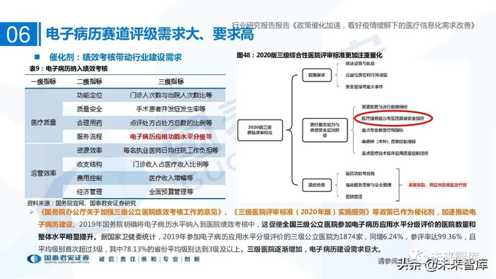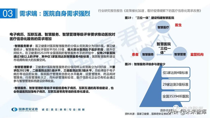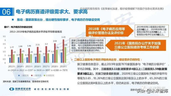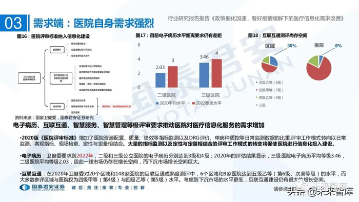 电子病历、互联互通、智慧服务、智慧管理等级评审要求推动医院对医疗信息化服务的需求增加。2020版《医院评审标准》增加了医院资源配置、质量、绩效等指标监测以及DRG评价、单病种质控等日常监测数据的比重,评审工作模式转向以日常 监测、客观指标、现场检查、定性与定量相结合。大量的指标监测以及定性与定量相结合的评审工作模式的转变将促使医院进行信息化投入建设。电子病历:卫健委要求到2022年,二级和三级公立医院的电子病历分别达到3级和4级;2020年的评估结果显示,三级医院电子病历平均等级3.46, 二级医院平均等级2.03,因此一线市场仍存在增长空间,而下沉市场增长空间巨大。互联互通:在2020年卫健委对20个区域和148家医院的互联互通成熟度测评中,6个区域和9家医院达到五级乙等(第6级、次高等级)的水平,而 大多数参评区域与医院仅为四级甲等(第4级)与四级乙等(第5级)水平。考虑到下沉市场的水平更低,互联互通建设仍有很大的增长空间。