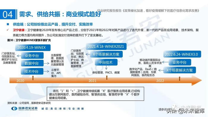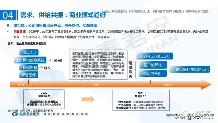 供给端:公司纷纷推出云产品,提升交付、实施效率 。卫宁健康:卫宁健康继2020年发布核心云产品之后,分别于2021年和2022年对其产品进行了迭代升级,新一代的产品在应用场景、技术架构、服 务能力等方面均有所提升,为公司实施交付效率的提升打下了坚实基础。创业慧康:2020年,公司发布了慧康云1.0,建立多态智联产品体系;为响应医疗行业云转型需求,公司又在2021年发布慧康云2.0,内外生态双 升级,生态模式转化,预计新产品的导入将提高公司整体交付、实施效率。