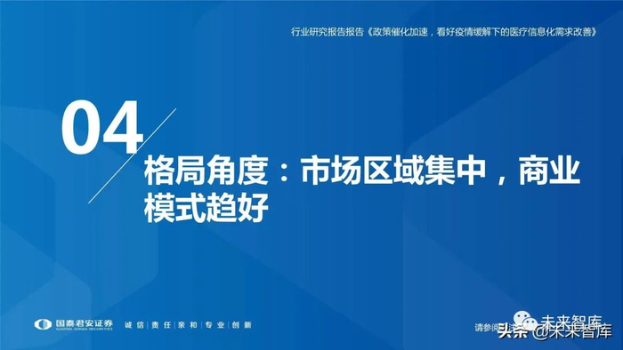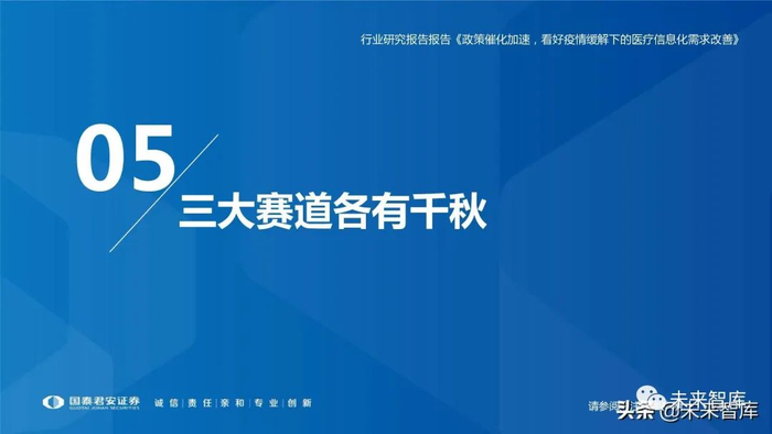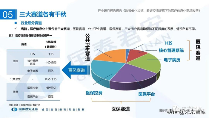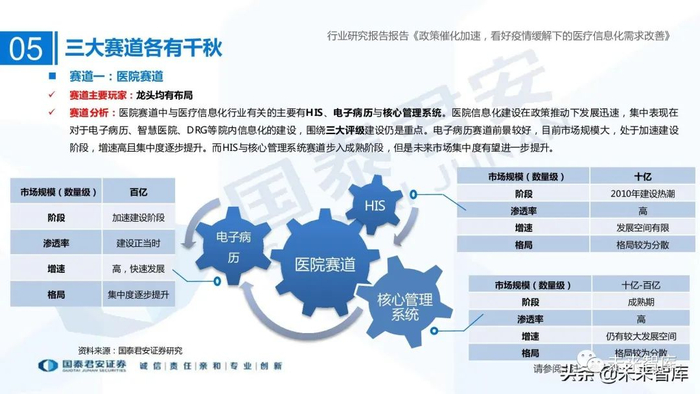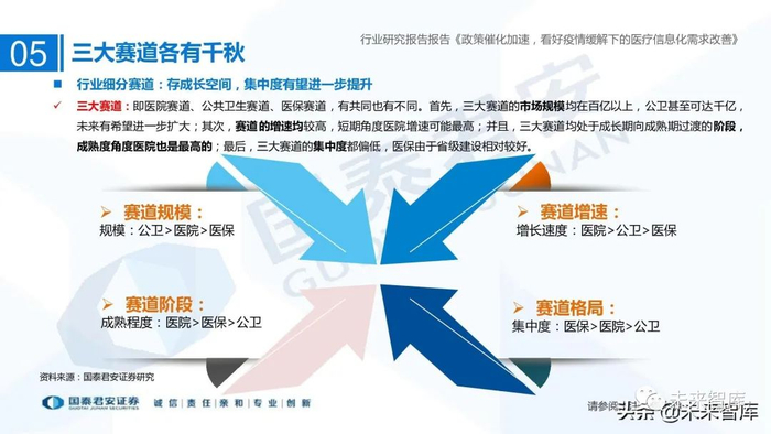 三大赛道:即医院赛道、公共卫生赛道、医保赛道,有共同也有不同。首先,三大赛道的市场规模均在百亿以上,公卫甚至可达千亿, 未来有希望进一步扩大;其次,赛道的增速均较高,短期角度医院增速可能最高;并且,三大赛道均处于成长期向成熟期过渡的阶段, 成熟度角度医院也是最高的;最后,三大赛道的集中度都偏低,医保由于省级建设相对较好。