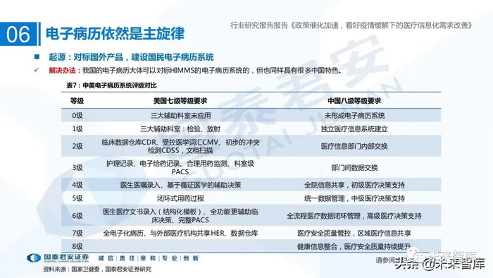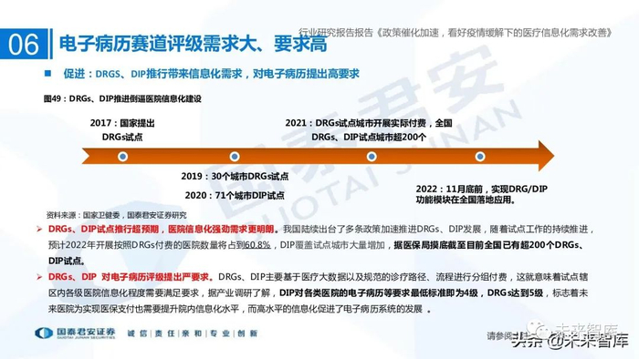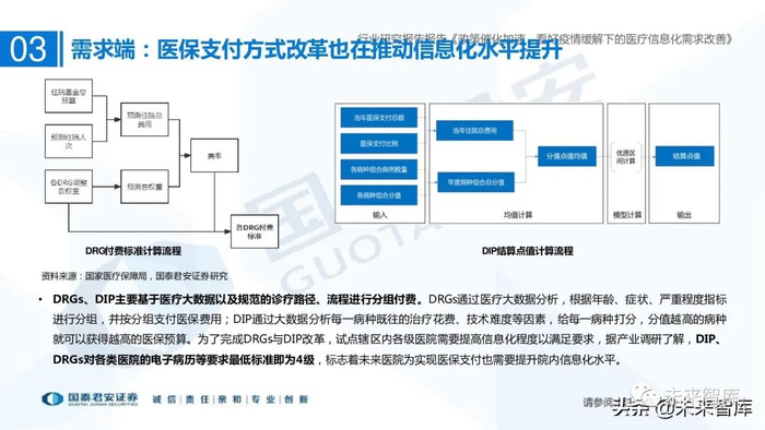 DRGs、DIP主要基于医疗大数据以及规范的诊疗路径、流程进行分组付费。DRGs通过医疗大数据分析,根据年龄、症状、严重程度指标 进行分组,并按分组支付医保费用;DIP通过大数据分析每一病种既往的治疗花费、技术难度等因素,给每一病种打分,分值越高的病种 就可以获得越高的医保预算。为了完成DRGs与DIP改革,试点辖区内各级医院需要提高信息化程度以满足要求,据产业调研了解,DIP、 DRGs对各类医院的电子病历等要求最低标准即为4级,标志着未来医院为实现医保支付也需要提升院内信息化水平。
