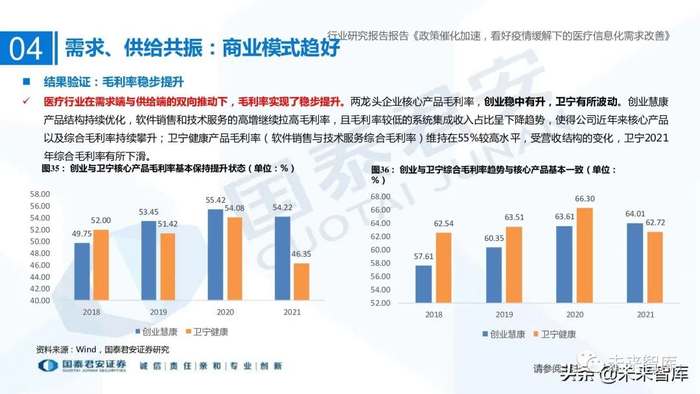 结果验证:毛利率稳步提升。医疗行业在需求端与供给端的双向推动下,毛利率实现了稳步提升。两龙头企业核心产品毛利率,创业稳中有升,卫宁有所波动。创业慧康 产品结构持续优化,软件销售和技术服务的高增继续拉高毛利率,且毛利率较低的系统集成收入占比呈下降趋势,使得公司近年来核心产品 以及综合毛利率持续攀升;卫宁健康产品毛利率(软件销售与技术服务综合毛利率)维持在55%较高水平,受营收结构的变化,卫宁2021 年综合毛利率有所下滑。