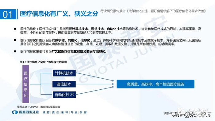 医疗信息化(医疗IT或HIT)是指利用计算机技术、通信技术、自动化技术等信息技术,突破传统医疗模式的限制,实现高质量、高 效率、个性化的医疗服务,进而提高医疗创新能力和医疗管理水平。医疗信息化即医疗服务的数字化、网络化、信息化,通过计算机科学和现代网络通信技术及数据库技术,为各医院之间以及医院所 属各部门之间提供病人病历和管理信息的收集、存储、处理、提取和数据交换,并满足所有授权用户的功能需求。医疗信息化主要可分为广义的医疗信息化和狭义的医疗信息化。