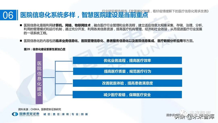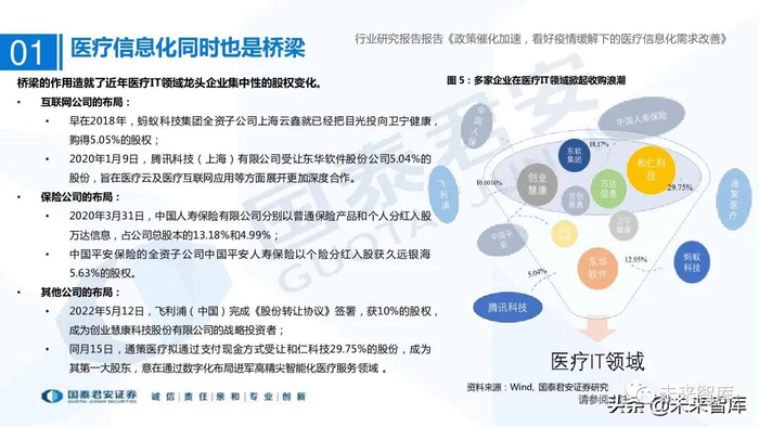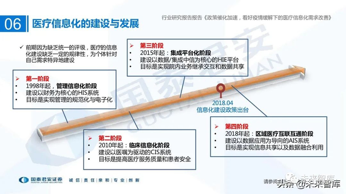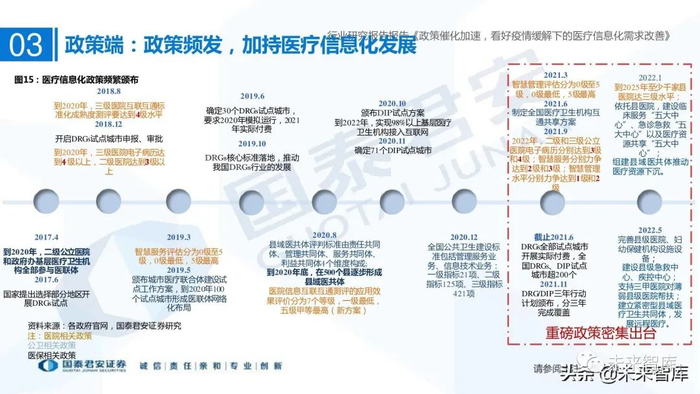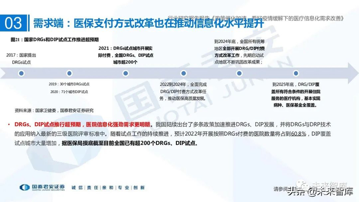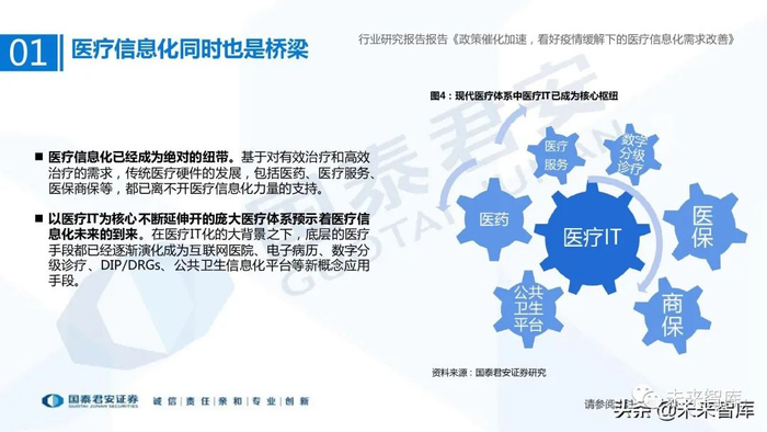 医疗信息化已经成为绝对的纽带。基于对有效治疗和高效 治疗的需求,传统医疗硬件的发展,包括医药、医疗服务、 医保商保等,都已离不开医疗信息化力量的支持。以医疗IT为核心不断延伸开的庞大医疗体系预示着医疗信 息化未来的到来。在医疗IT化的大背景之下,底层的医疗 手段都已经逐渐演化成为互联网医院、电子病历、数字分 级诊疗、DIP/DRGs、公共卫生信息化平台等新概念应用 手段。