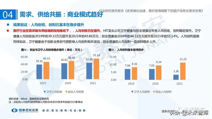 结果验证:人均创收、创利已基本在稳步提升。医疗行业在需求端与供给端的双向推动下,,人均创收已在提升。HIT龙头公司卫宁健康与创业慧康近年来人均创收、创利稳定提升。卫宁 健康人均创收由2019年的39.32万元提升至2021年的43.86万元;创业慧康由2019年的46.33万元提升至2021年的55.14%。人均创利趋势 同样如此,卫宁健康由于创新业务的亏损影响人均创利有所波动,创业慧康的人均创利一直保持稳步上升。