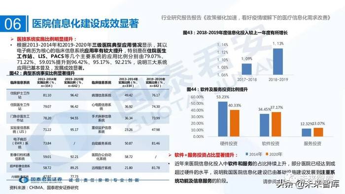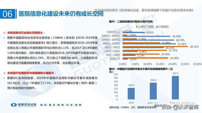 未来信息化行业成长空间较大:根据中国医院协会信息专业委员会(CHIMA)发布的《2018-2019年度 中国医院信息化状况调查报告》统计显示,受调查医院在2018-2019年度 信息化投入预算占年度预算的平均比例约为1.13%,较2017-2018年度的 1.09%有所增长,另外报告显示三级医院2018-2019年度平均信息化投入 预算占年度预算比例为1.29%,而三级以下医院为0.96%,三级医院在信 息化建设方面重视程度更高,但占比均不高,总金额也不高。