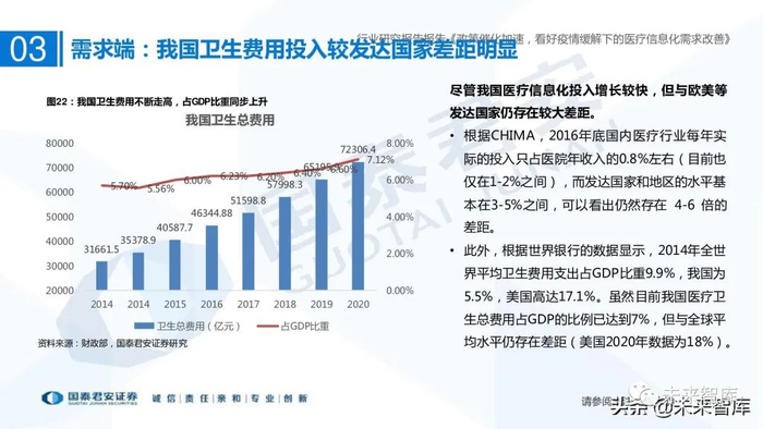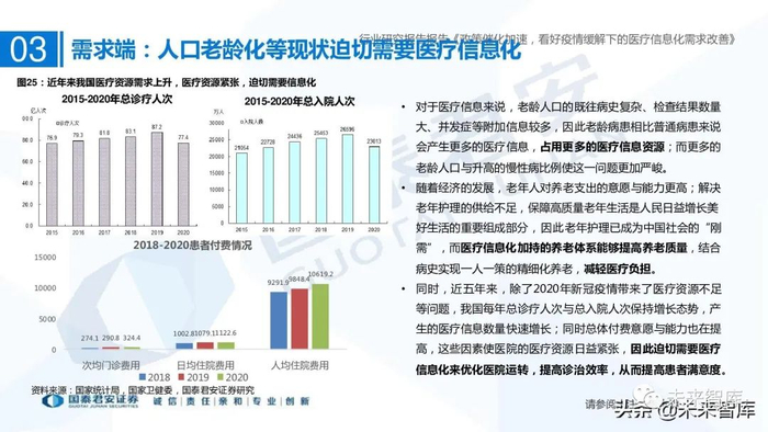 同时,近五年来,除了2020年新冠疫情带来了医疗资源不足 等问题,我国每年总诊疗人次与总入院人次保持增长态势,产 生的医疗信息数量快速增长;同时总体付费意愿与能力也在提 高,这些因素使医院的医疗资源日益紧张,因此迫切需要医疗 信息化来优化医院运转,提高诊治效率,从而提高患者满意度。