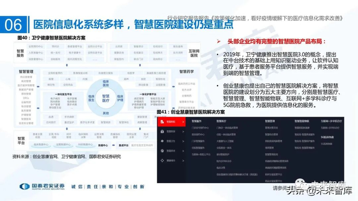 头部企业均有完整的智慧医院产品布局:2019年,卫宁健康推出智慧医院3.0的概念,提出 在中台技术的基础上用知识驱动业务,让软件认知 医疗,基于患者服务平台提供智慧服务,并实现端 到端的智慧管理。创业慧康也提出自己的智慧医院解决方案,将智慧 医院的建设划分为五大主要方向,分别是智慧医疗、 智慧管理、智慧智能物联、互联网+多学科诊疗与 5G院前急救,为医院提供信息化的服务。