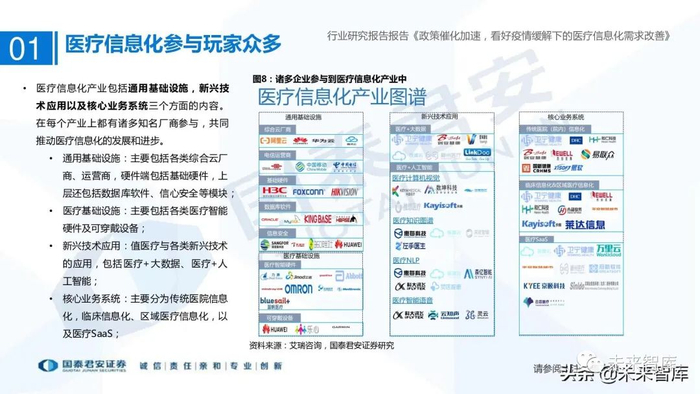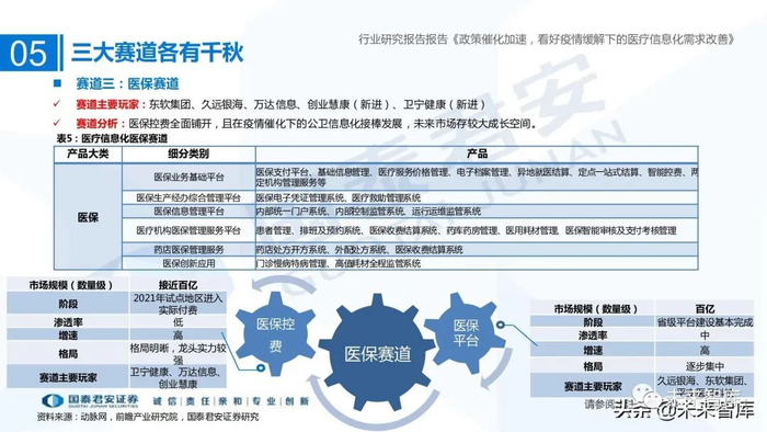 赛道主要玩家:东软集团、久远银海、万达信息、创业慧康(新进)、卫宁健康(新进) 。赛道分析:医保控费全面铺开,且在疫情催化下的公卫信息化接棒发展,未来市场存较大成长空间。
