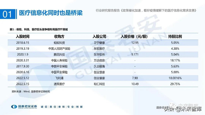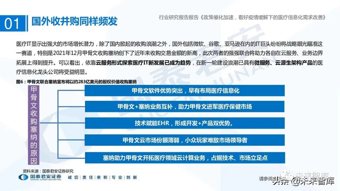 医疗IT显示出强大的市场增长潜力,除了国内掀起的收购浪潮之外,国外包括微软、谷歌、亚马逊在内的IT巨头纷纷将战略眼光瞄准这 一赛道,特别是2021年12月甲骨文收购塞纳创下了近年来收购交易金额的新高,此次两者的强强联合将助力各自在云服务、业务边界 拓展上得到提升。可以看出,依靠云服务形式探索医疗IT新发展已成为趋势,在新一轮建设浪潮已具有微服务、云源生架构产品的医 疗信息化龙头公司将受益明显。