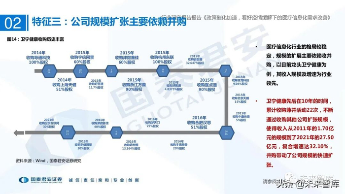 医疗信息化行业的格局较稳 定,规模的扩展主要依赖收并 购,以目前龙头卫宁健康为 例,其收入规模及增速为行业 领先。卫宁健康先后在10年的时间, 累计收购兼并活动22次,不断 通过收购其他公司扩张规模, 使得收入从2011年的1.70亿 元的规模到了2021年的27.50 亿元,复合增速达32.10%, 并购带动了公司规模的快速扩 张。