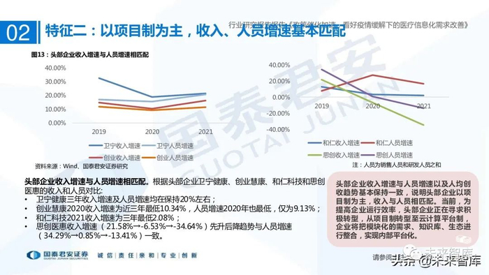 头部企业收入增速与人员增速相匹配。根据头部企业卫宁健康、创业慧康、和仁科技和思创 医惠的收入和人员对比: 卫宁健康三年收入增速及人员增速均在保持20%左右;创业慧康2020收入增速为近三年最低10.34%,人员增速2020年也最低,仅为9.13%;和仁科技2021收入增速为三年最低2.08%;思创医惠收入增速 (21.58%→-6.53%→-34.64%)先升后降趋势与人员增速 (34.29%→0.85%→-13.41%)一致。