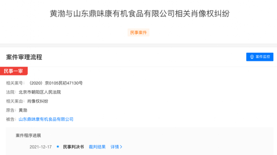 天眼查APP显示,近日,黄渤与山东鼎味康有机食品有限公司姓名权纠纷民事一审判决书公布。