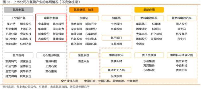 天风证券唐婕在7月29日发布的研报中表示,电解水制氢涉及的上市公司主要为宝丰能源、北京科锐、 华电重工、国电电力、新奥股份、新天绿能、吉电股份、隆基绿能等。
