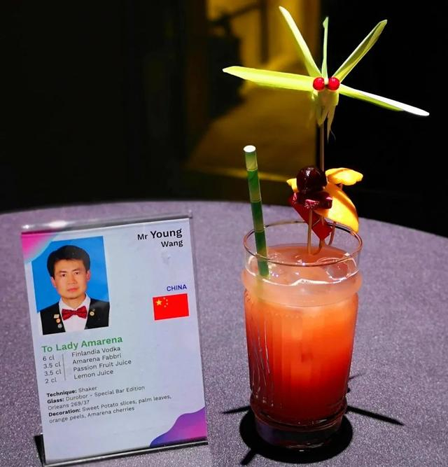 “第66届锦标赛我也用了草编的蜻蜓这一装饰物,但那时候技术还不够成熟。到了第67届锦标赛,半分钟就能编完一个蜻蜓,和鸡尾酒整体的搭配效果也更好了,评委看了、吃了阿玛雷娜樱桃装饰物之后,品鉴To Lady Amarena鸡尾酒,酒体味道更浓厚,装饰物橙皮的苦味与酒体酸甜的对比作用,让这杯酒喝的时候有不同层次的变化。”