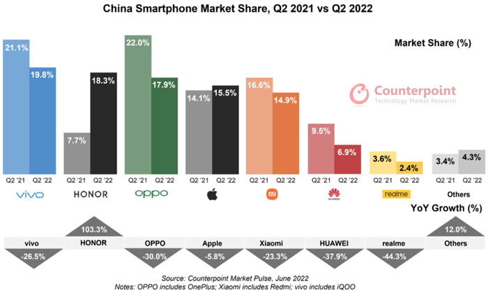 专业数据分析机构Counterpoint公布的2022年Q2国内手机市场销量数据显示,位列市场份额TOP5的分别是:vivo(19.8%)、荣耀(18.3%)、OPPO(17.9%)、苹果(15.5%)与小米(14.9%),而在2022年Q1,获得市场份额冠军的也是vivo。