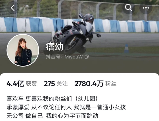 尚未大红大紫前,坐拥千万粉丝的网红痞幼在抖音签名中写道,一夜爆火后,这段签名改成了“喜欢车,更喜欢我的粉丝们”。在短视频平台凭借发布“机车日常”,痞幼短时间内涨粉数百万。唱歌走调,跳舞顺拐,妖魔鬼怪辈出的社交网络上,痞幼靠着火辣的身材,以摩托车为标签杀出一条血路。