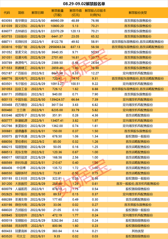 数据宝统计,本周大比例解禁股较多,南华期货、国义招标、吉林碳谷3股首发原股东限售股份解禁,比例均在70%以上;日辰股份、宏微科技、中国广核、果麦文化等4股的解禁比例也均超过50%。