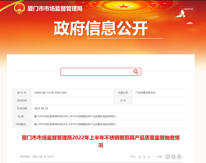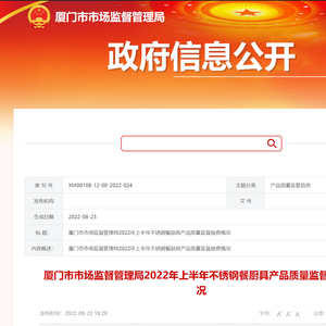 厦门市市场监督管理局2022年上半年不锈钢餐厨具产品质量监督抽查情况