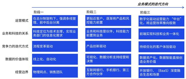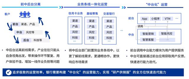传统银行采取前中后台分离的运营模式,中后台远离前线,难免和客户需求脱节,其风控规则或系统开发往往从自身职能视角出发,带来管控流于形式、操作环节繁复、用户体验不佳、增加一线作业负担等问题。很多银行意识到这些问题,将产品、风险、科技等中后台部门前置到业务条线中,开展业务条线一体化运营的模式转型,更快响应市场需求。