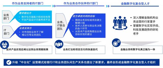 领先银行打造敏捷型组织,推动业技融合。敏捷型组织是业务和技术组成联合团队,承担共同的业务目标或项目目标,牵引双方融合。技术人员参与到业务决策中,并从技术产品视角提出业务目标实现的建议,更快速高效地赋能业务团队从数字化角度思考业务行动。随着银行数字化程度的加深,产品迭代周期加速,对人才能力的要求将会以金融数字化复合型人才为主。总行产品团队应该是既懂金融业务的行家里手,也是掌握数字化实现手段的斫轮老手 ,业务和数字化真正融为一体。