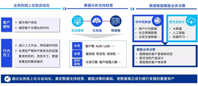 数据智能第一步是业务的线上化和自动化。通过业务线上化与自动化,从客户视角,可以提升用户体验,缩短客户办理业务时间;从行内视角,可以通过系统数据流转、机器计算处理等技术手段,减少人工作业、降低操作风险。第二步是数据分析支持经营。通过数字化经营分析工具,数据转化为经营成果和过程的可视化反馈。银行利用数据分析,打造驾驶舱、仪表盘等数字化管理工具,实现对战略、业务、运营和组织结构的量化检视,支持管理决策。