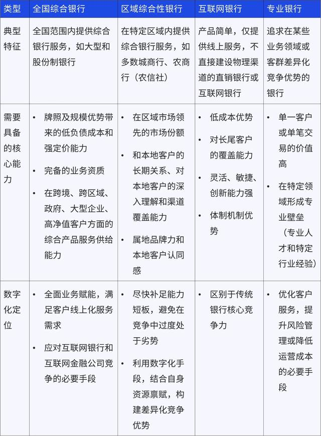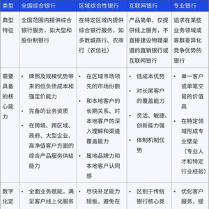 在讨论数字化转型将为银行带来哪些根本性转变之前,有必要对数字化视角下的未来银行进行展望。依据银行业务综合性(复杂程度)以及线上化率(对客户经理等物理渠道依赖程度),可以分为全国综合性银行、区域综合性银行、互联网银行和专家银行四个类型。