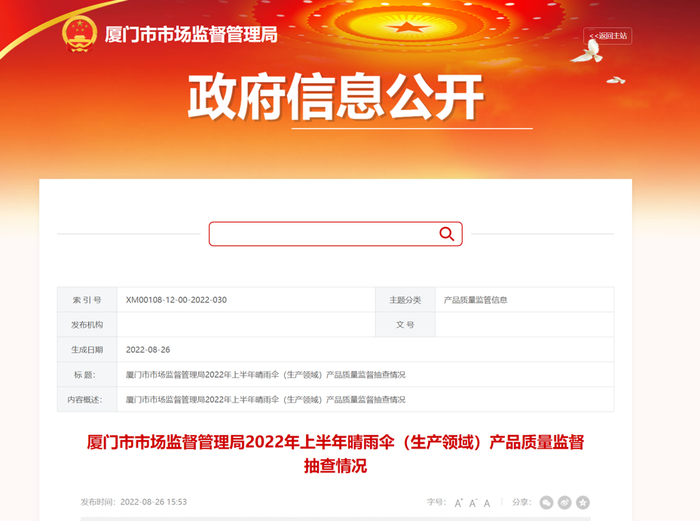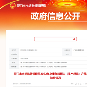 厦门市市场监督管理局2022年上半年晴雨伞(生产领域)产品质量监督抽查情况