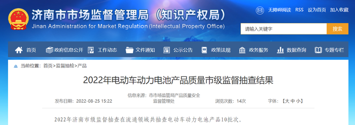 山东省济南市市场监管局发布2022年电动车动力电池产品质量市级监督抽查结果