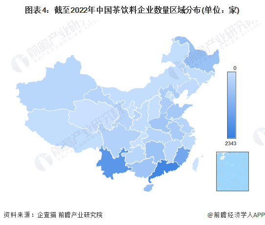 根据中国企业数据库企查猫,目前中国茶饮料企业主要分布在广东省和云南省。截至2022年8月,广东省共有相关茶饮料企业数2343家,云南省则有1906家。