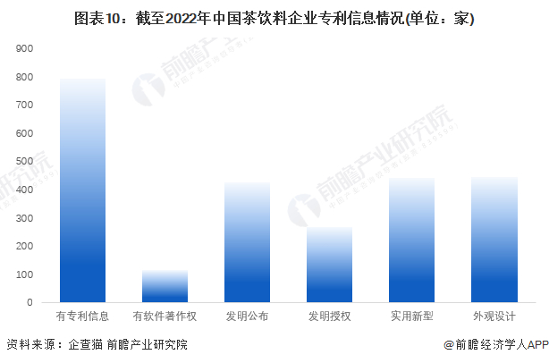 根据中国企业数据库企查猫,目前存续和在业的企业共10565家,其中794家企业有专利信息,116家企业有软件著作权。在专利信息中,茶饮料企业以外观设计和实用新型为主,拥有外观设计专利的企业有446家,拥有实用新型专利的企业有443家。