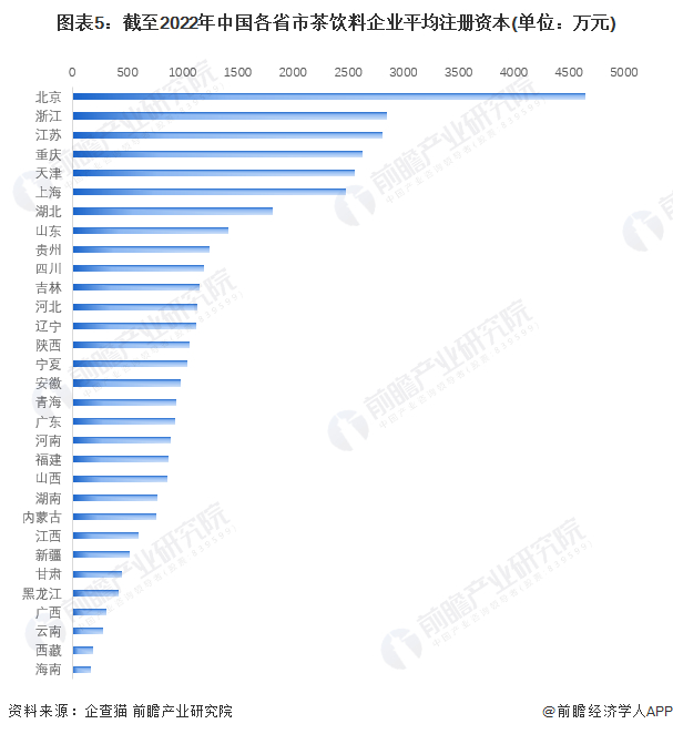 根据中国企业数据库企查猫,目前中国茶饮料企业的平均注册资本区域分布中,北京市相关企业的平均注册资本最高,为4653万元,除此之外,浙江、江苏、重庆、天津、上海的茶饮料企业平均注册规模均在2000万元以上,规模相对较大。
