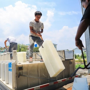 而在食用冰块之外,一种专门用于降温的“工业冰块”也火了。这些冰块不同于可直接入口的食用冰,重量通常在80斤左右,采用含盐的卤水制作,降温快,化水慢,室内情况下可以使用10个小时以上,室外也能使用6-8个小时。