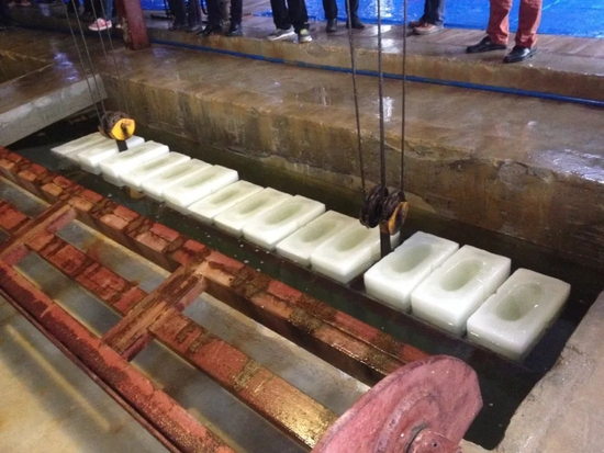 那么,如此大量的冰块是如何生产的呢?据前述专家介绍,制冰的本质与家用冰箱制冷同理,技术门槛并不高。其原理是利用盐水凝固点比淡水低的特性,将注满淡水的模具放到零下十几摄氏度的盐水池中冷却若干小时。待冷却完毕,再将模具浸入常温的水中,使冰块边缘融化,与铁皮分离。