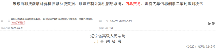 8月23日,裁判文书网发布的《朱东海非法获取计算机信息系统数据、非法控制计算机信息系统、内幕交易、泄露内幕信息刑事二审刑事判决书》将案情抽丝剥茧,朱海东的犯案手段也得以揭露。该判决书的落款日期为2021年4月14日。