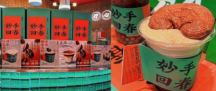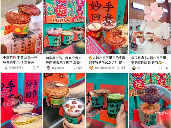 立吞街的“本草纲目”系列除了“一棵大灵芝”外,同时还上架了红花出番啡萃、仙草石斛咖啡、橘香出陈啡萃、黑麻麻厚乳拿铁,分别用到了藏红花、石斛、陈皮、何首乌等中草药元素。