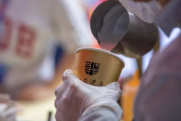 咖啡上立着一个杯口大小的灵芝,杯套上还印着“妙手回春”四个大字,很是吸睛,“拿在手里路过行人都在围观。”
