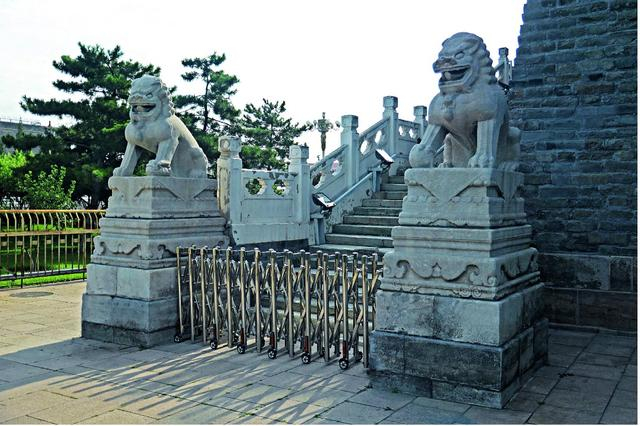 近百年来,这对重达几吨的守门石狮,先后被移动过数次,终于安家于现在的摆放位置。空气中的有害物质腐蚀着石狮,石狮表面已斑驳;游人的不文明行为,也伤害磨损了古代石狮。石狮是受到法律保护的文物,虽然从皇城威武的守门神兽,变成现在城门前的装饰文物古迹,但依旧受到人们的喜爱。2018 年,石狮被添加了汉白玉石护栏,城门洞南口两石狮之间地面设置了“中国公路零公里点”标志,中国四面八方的道路都以此标志为起点来计算路程,也算给古石狮添了一个伴。