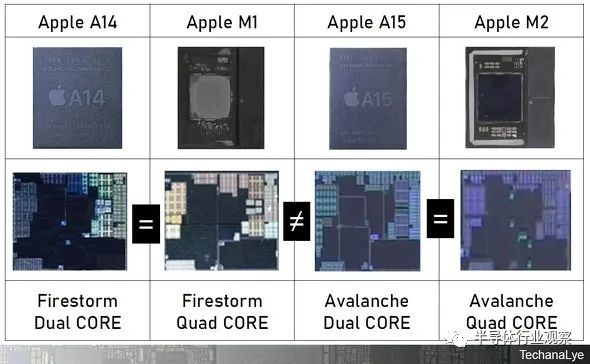 A14 和 M1 具有相同的 CPU(形状和大小),A15 和 M2 具有相同的 CPU。A14使用2个CPU,M1使用4个CPU,A15使用2个CPU,M2使用4个CPU。这张照片清楚地表明,Apple 正在理想地开发一个生态系统(内部 IP),该生态系统使用在同一家公司内花费时间和精力设计的资产。笔者也曾在一家半导体厂商开发过CPU等多个IP,但即使在同一家公司内,也有很多不同部门分开开发的经验,内部IP的彻底转换也在进行中。由此可见,苹果高度统一。