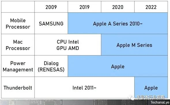 表 5简要总结了 Apple 产品的“内部生产历史”。虽然没有在表中显示,但苹果也在内部生产用于耳机和智能手表的 Wi-Fi 芯片、蓝牙音频芯片、UWB(超宽带)通信芯片等。