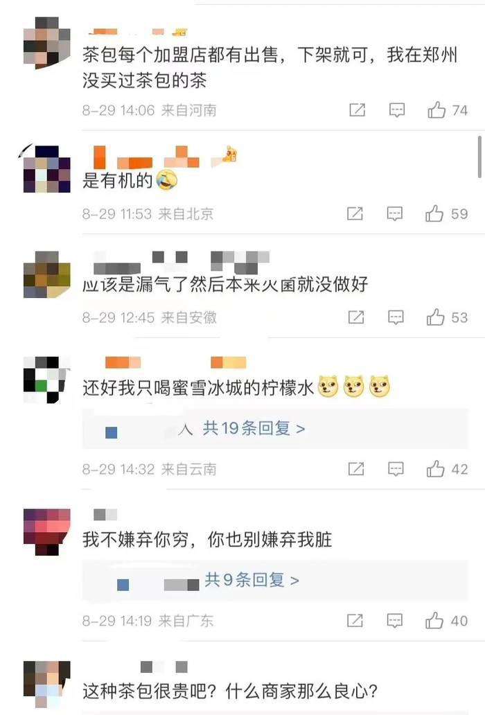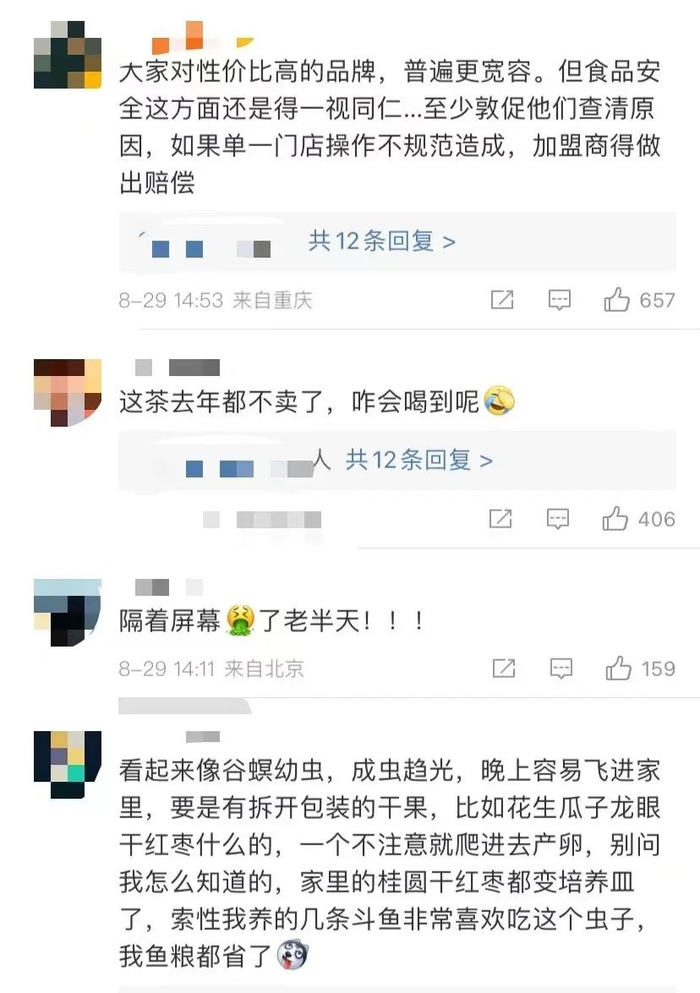 网友表示,“蜜雪冰城挺便宜的,但也要加强卫生保障”。不过也有网友怀疑,“茶包本来就容易生虫子”“可能是消费者自导自演的把戏”。